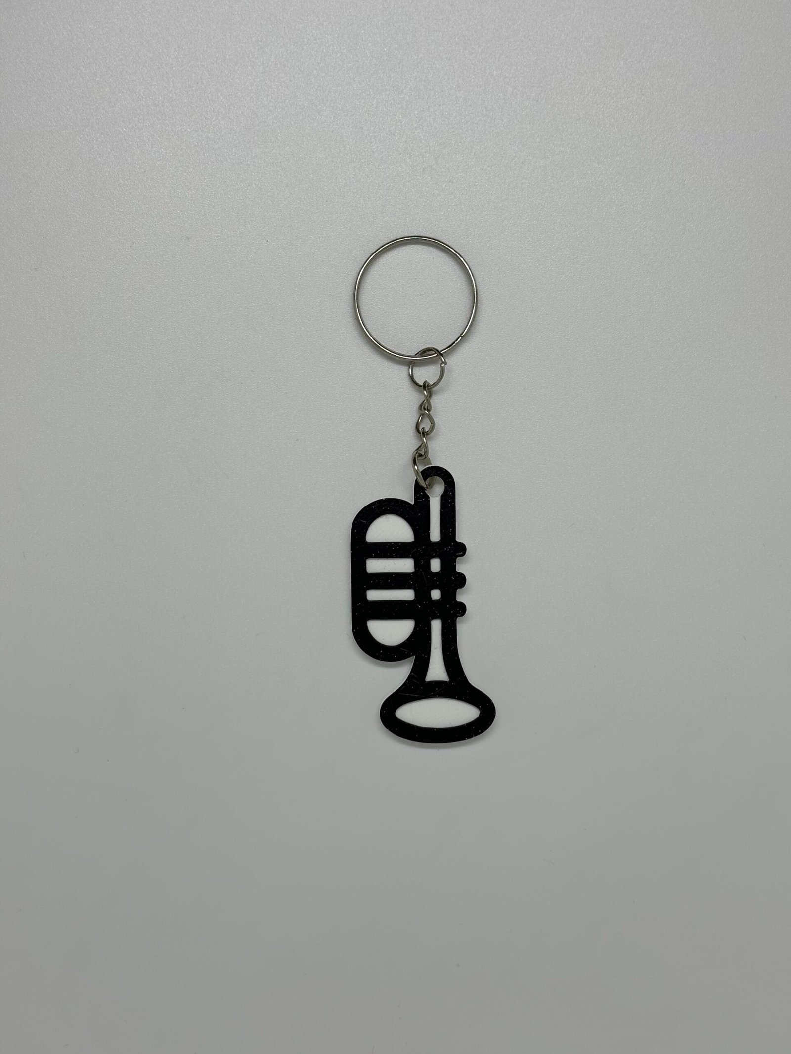 Llavero metálico con diseño de trompeta. Ideal para músicos, estudiantes o como recuerdo musical.